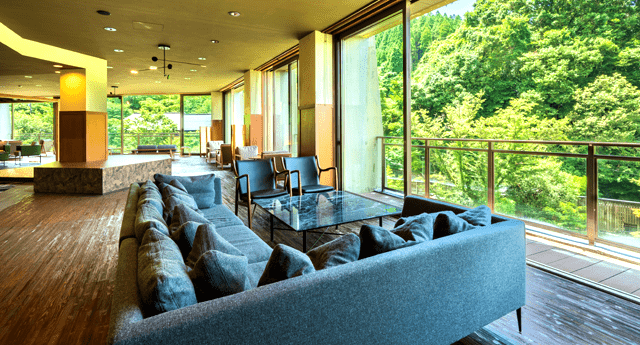 A lobby with full of glass walls. Enjoy an elegant moment gazing at the great outdoors…