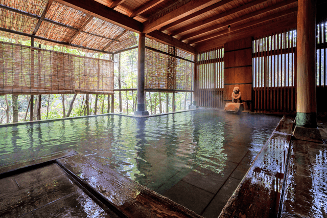 4개의 대욕장(실내 온천), 3개의 노천탕(야외 온천), 2개의 대절탕(실내 온천)은 모두 원천수를 그대로 흘려 보내는 방식인 "원천 카케나가시"로 시설내에서 온천투어를 즐길 수 있습니다.